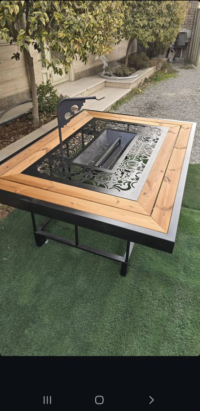 میز اتشدان ۲×۱۲۰ ، ترکیب چوب و فلز ، با ورق لیزر شده ۲ میل ، با اویز کتری ،
